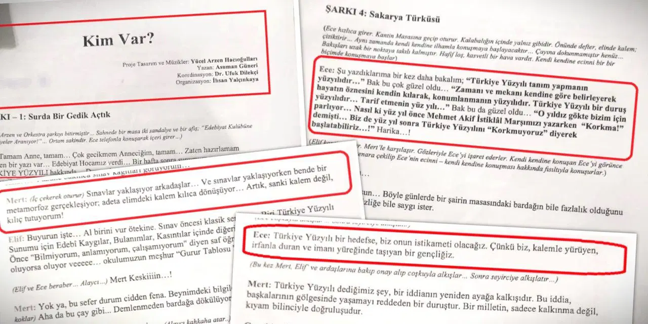 Yine oyunda AKP’nin seçim sloganı olarak kullandığı “Türkiye Yüzyılı” sloganının birçok kez geçtiği, öğrenciler için “Türkiye Yüzyılı bir hedefse, biz onun istikameti olacağız. Türkiye Yüzyılı dediğimiz şey, bir iddianın yeniden ayağa kalkışıdır. Bu iddia, başkalarının gölgesinde yaşamayı reddeden bir duruştur. Bir milletin, sadece kalkınma değil, kıyam bilinciyle doğruluşudur” gibi replikler yazıldığı görülüyor.