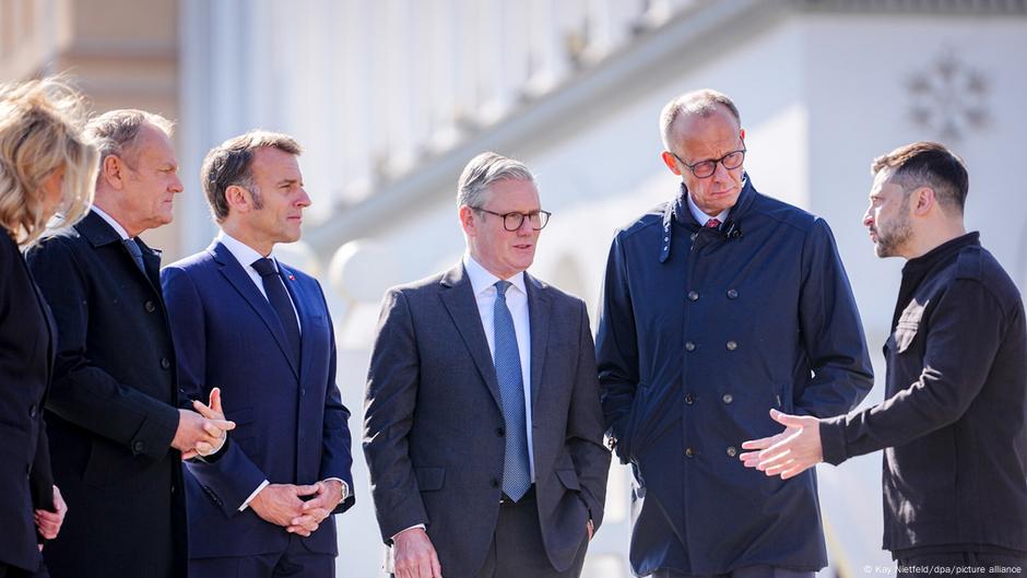 Polonya Başbakanı Donald Tusk, Fransa Cumhurbaşkanı Emmanuel Macron, İngiltere Başbakanı Keir Starmen ve Almanya Başbakanı Friedrich Merz, Cumartesi günü Kiev’i ziyaret ederek Ukrayna Devlet Başkanı Volodimir Zelenskiy ile bir araya geldi. Fotoğraf: Kay Nietfeld/dpa/picture alliance