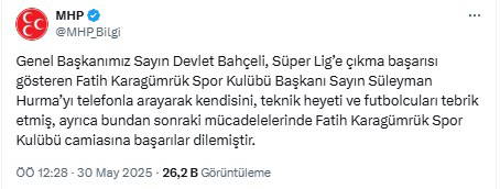 MHP’nin sosyal medya hesabından yaptığı paylaşımda, “Genel Başkanımız Sayın Devlet Bahçeli, Süper Lig’e çıkma başarısı gösteren Fatih Karagümrük Spor Kulübü Başkanı Sayın Süleyman Hurma’yı telefonla arayarak kendisini, teknik heyeti ve futbolcuları tebrik etmiş, ayrıca bundan sonraki mücadelelerinde Fatih Karagümrük Spor Kulübü camiasına başarılar dilemiştir” ifadeleri kullanıldı.