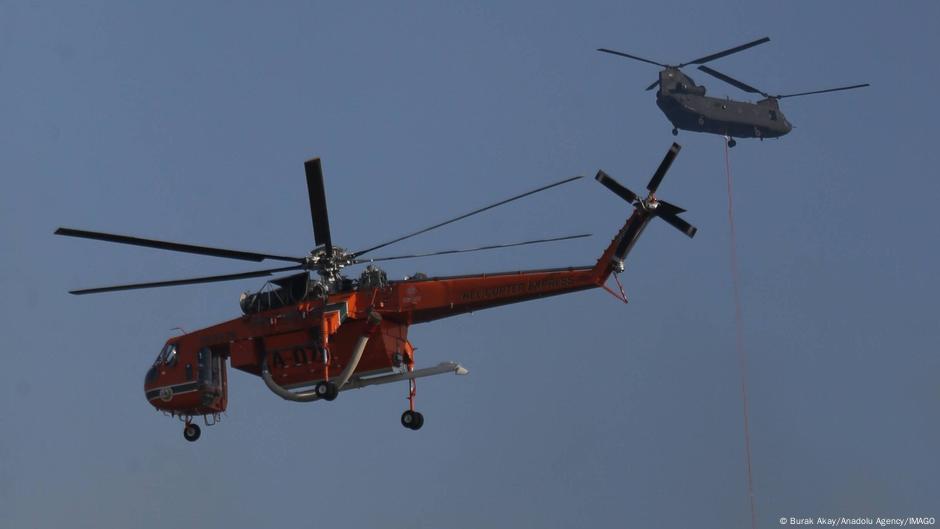 Çanakkale’de orman yangınına müdahale eden iki farklı tipte helikopterFotoğraf: Burak Akay/Anadolu Agency/IMAGO