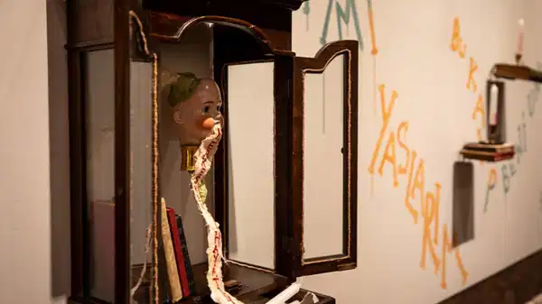 Sergi ziyaretiniz boyunca, size ritmik bir ses eşlik ediyor: Anne karnındaki bir bebeğin kalp atışları… Bu ses, Doğruyol’un “kayıp, dönüşüm ve yeniden doğuş” temalarını izleyiciye aktarmak için önemli bir rol üstleniyor. Çünkü her kalp atışı; geçmişten kalan ama artık işe yaramadığı düşünülen eşyalarla sanatçının ellerinde yeni bir forma, yeni bir bedene dönüşen bozulmuş objeler, kırık parçalarla bütünleşiyor. Sergi sizi aynı zamanda hem çocukluğunuza hem de şamanik bir ritüelin tam ortasına götürüyor. Çocukken hepimizin elinde yer eden “kâğıt tuzluk” ve bir dilek ağacı, ilk katın tam ortasında sizleri bekliyor. Burada ister kâğıttan tuzluktan size çıkan sözcüğü, isterseniz dileğinizi bir kâğıda yazıp dilek ağacına asabiliyorsunuz. Ve serginin sonunda, dilek mumları sizi karşılıyor.
