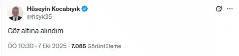 Eski AKP İzmir Milletvekili Hüseyin Kocabıyık, sosyal medya hesabından yaptığı açıklamada, “gözaltına alındım” ifadesini kullandı.