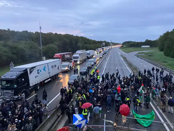 Montpellier’de ise kavşaklarda kurulan barikatlar nedeniyle trafik felç oldu; aksiyoncular “Macron istifa” yazılı pankartlar taşıdı.