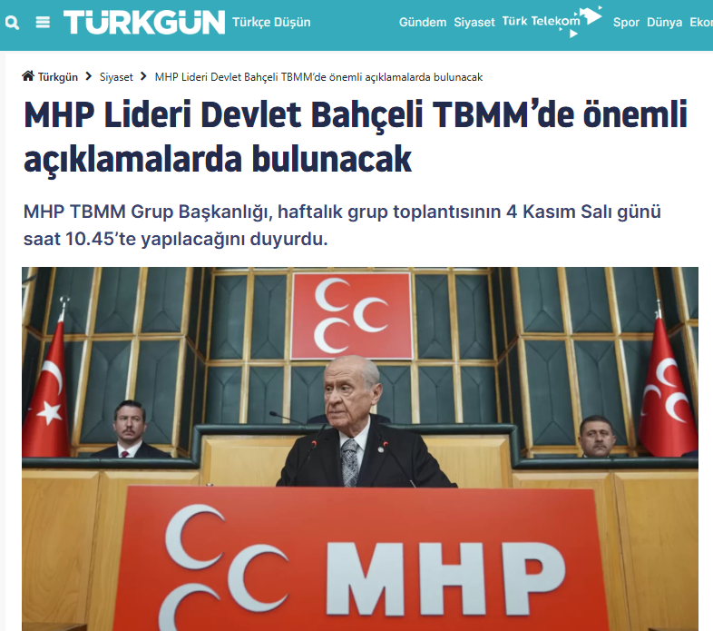 MHP’ye yakınlığıyla bilinen yayın organı Türkgün, Bahçeli’nin yarın TBMM’de değerli açıklamalarda bulunacağını duyurdu.