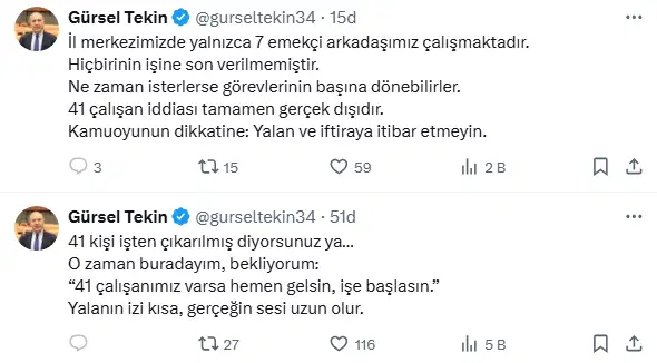 Gürsel Tekin’den işten çıkarma savına cevap: 41 çalışanımız varsa çabucak gelsin, işe başlasın