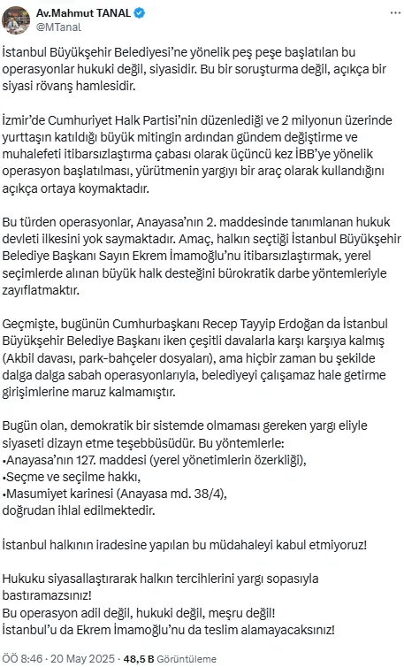 “İstanbul Büyükşehir Belediyesi’ne yönelik peş peşe başlatılan bu operasyonlar hukuki değil, siyasidir. Bu bir soruşturma değil, açıkça bir siyasi rövanş hamlesidir. İzmir’de Cumhuriyet Halk Partisi’nin düzenlediği ve 2 milyonun üzerinde yurttaşın katıldığı büyük mitingin ardından gündem değiştirme ve muhalefeti itibarsızlaştırma çabası olarak üçüncü kez İBB’ye yönelik operasyon başlatılması, yürütmenin yargıyı bir araç olarak kullandığını açıkça ortaya koymaktadır. Bu türden operasyonlar, Anayasa’nın 2. maddesinde tanımlanan hukuk devleti ilkesini yok saymaktadır. Amaç, halkın seçtiği İstanbul Büyükşehir Belediye Başkanı Sayın Ekrem İmamoğlu’nu itibarsızlaştırmak, yerel seçimlerde alınan büyük halk desteğini bürokratik darbe yöntemleriyle zayıflatmaktır. Geçmişte, bugünün Cumhurbaşkanı Recep Tayyip Erdoğan da İstanbul Büyükşehir Belediye Başkanı iken çeşitli davalarla karşı karşıya kalmış (Akbil davası, park-bahçeler dosyaları), ama hiçbir zaman bu şekilde dalga dalga sabah operasyonlarıyla, belediyeyi çalışamaz hale getirme girişimlerine maruz kalmamıştır”