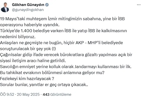 CHP Grup Başkanvekili Gökhan Günaydın, “İstanbul’u da Ekrem İmamoğlu’nu da teslim alamayacaksınız! CHP Grup Başkanvekili Gökhan Günaydın,19 Mayıs’taki muhteşem İzmir mitingimizin sabahına, yine bir İBB operasyonu haberiyle uyandık. Türkiye’de 1.400 belediye varken İBB ile yatıp İBB ile kalkılmasının nedenini biliyoruz. Anlaşılan ne geçmişte ne bugün, hiçbir AKP – MHP’li belediyede soruşturulacak bir şey yok (!) Çağırılsalar gidip ifade verecek bürokratlara gözaltı yapılması açık bir siyasi iletişim aracı haline getirildi. Savcılığın emniyet yerine kolluk olarak Jandarmayı kullanması bir ilk. Bu tahkikat evrakının bölünmesi anlamına geliyor mu? Fezlekeyi kim hazırlayacak ? Sorular bunlar, yanıtlar er geç ortaya çıkacak.” ifadelerini kullandı.