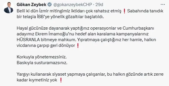 “Belli ki dün İzmir mitingimiz iktidarı çok rahatsız etmiş! Sabahında tanıdık bir telaşla İBB’ye yönelik gözaltılar başlatıldı. Hayal gücünüze dayanarak yaptığınız operasyonlar ve Cumhurbaşkanı adayımız Ekrem İmamoğlu’nu hedef alan karalama kampanyalarınız HÜSRANLA bitmeye mahkum. Yıpratmaya çalıştığınız her hamle, halkın vicdanına çarpıp geri dönüyor! Korkuyla yönetemezsiniz. Baskıyla susturamazsınız. Yargıyı kullanarak siyaset yapmaya çalışanlar, bu halkın gözünde artık zerre kadar kıymetiniz yok!”