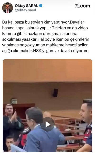 AKP Genel Başkanı ve Cumhurbaşkanı Recep Tayyip Erdoğan’ın Başdanışmanı Oktay Saral, tutuklu Ekrem İmamoğlu’nun mahkemedeki görüntülerinin sosyal medyada çekilmesine tepki göstererek Hakimler ve Savcılar Kurulu’nu (HSK) mahkeme heyetini açığa alması çağrısı yaptı.
