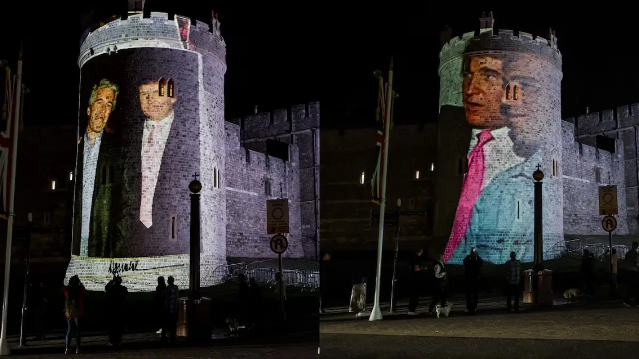 Protestocular evvel kalenin yakınında Trump ve Epstein’ın yer aldığı büyük bir pankart açtı. Daha sonra kalenin bir kulesine, iki ismin fotoğraflarını, Epstein’ın kurbanlarının görsellerini, dava haberlerini ve polis raporlarını yansıttılar.