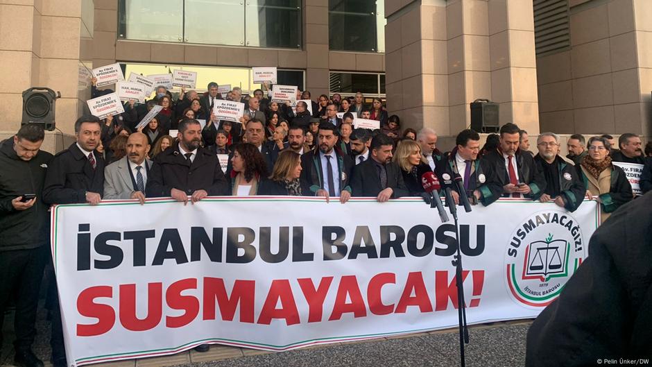 21 Mart’taki duruşma sonrasında Baro Başkanı Kaboğlu, adliye önünde yaptığı açıklamada “görevden alma” kararına reaksiyon göstermişti. Fotoğraf: Pelin Ünker/DW