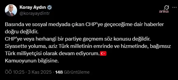 Bağımsız Ankara Milletvekili Koray Aydın, sosyal medya hesabından CHP’ye geçeceği yönündeki iddialara yanıt verdi.