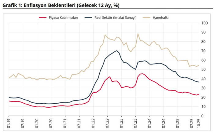Rapora göre, ekim ayında 12 ay sonrası yıllık enflasyon beklentileri bir önceki aya kıyasla piyasa katılımcılarında 1,01 puan artarak yüzde 23,26’ya çıktı. Hanehalkı beklentisi 1,40 puan yükselerek yüzde 54,39’a ulaşırken, reel sektör beklentisi 0,50 puan azalarak yüzde 36,30’a geriledi.