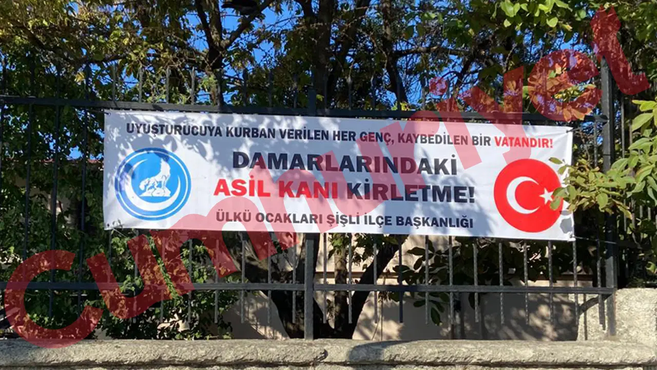 Ülkü Ocakları Şişli İlçe Başkanlığı tarafından uyuşturucu kullanımına tepki gösterilen pankartta, “Uyuşturucuya kurban verilen her genç, kaybedilen bir vatandır. Damarlarındaki asil kanı kirletme” ifadeleri yer aldı.