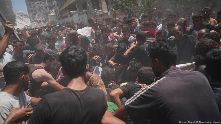 Gazze’de İsrail’in henüz işgal etmediği az sayıda bölgede büyük nüfus yoğunluğu bulunuyor. Fotoğrafta yardım malzemelerine ulaşmaya çalışan Filistinliler görülüyor.Fotoğraf: Jehad Alshrafi/AP Photo/picture alliance