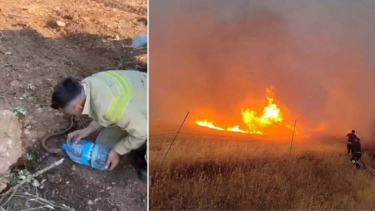 Orman işçisi, yangından etkilenen oluklu kertenkeleyi su vererek serinletti
