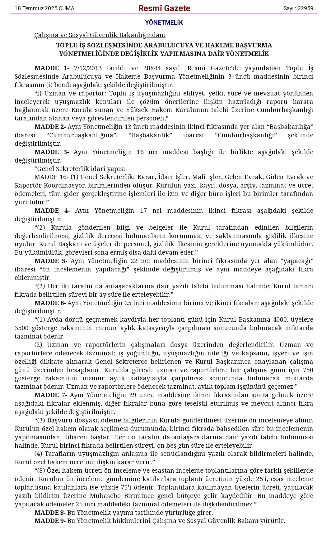 Resmî Gazete’de yayımlanan Toplu İş Sözleşmesinde Arabulucuya ve Hakeme Başvurma Yönetmeliğinin 3 üncü maddesinin birinci fıkrasının (i) bendi değiştirildi.