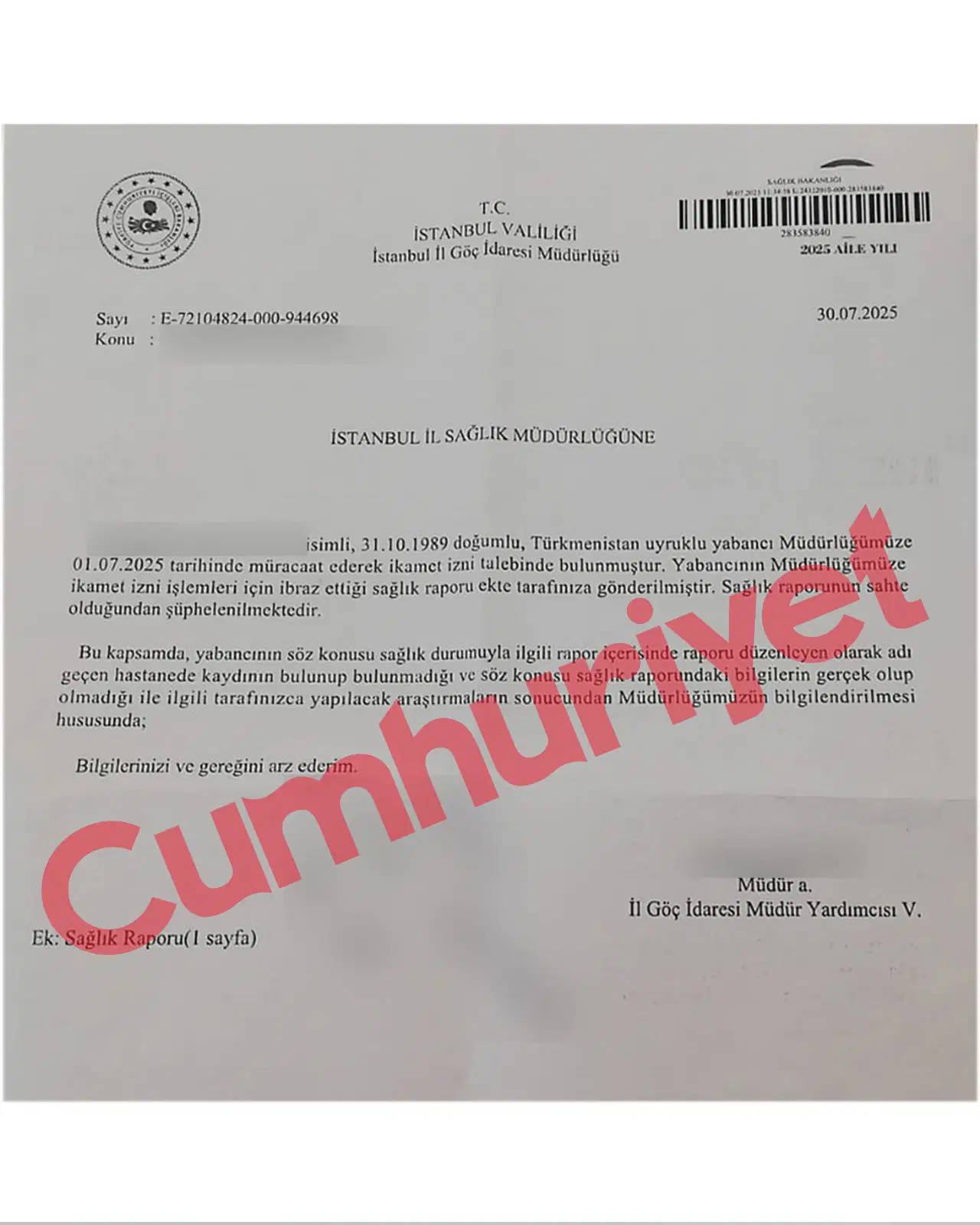 Sahte diploma skandalının ardından şimdi de sahte içerikli sağlık raporları gündemde. Yabancı uyruklu O.S. isimli bir yurttaş, İstanbul İl Göç İdaresi’ne ikamet izni için başvuruda bulundu. Başvuru evrakları arasında yer alan sağlık raporunda, kişinin bir yıl boyunca seyahat edemeyeceği belirtiliyordu. 26 Haziran tarihli rapor, Beylikdüzü Devlet Hastanesi’nden düzenlenmiş gibi görünüyordu. Ancak belgede adı geçen hekimin kimlik numarası ile tıbbi branşı uyumsuzdu. Bu tutarsızlık, sağlık personeli tarafından fark edilince sahtekârlık şüphesi doğdu.