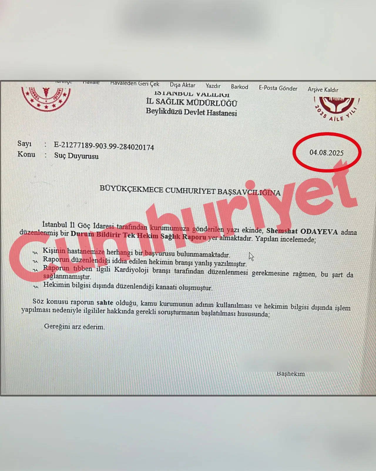 Suç duyurusu yazısında şu ifadeler yer aldı: Kişinin hastaneye herhangi bir başvurusu yok. Raporu düzenlediği iddia edilen hekimin branşı yanlış yazılmış. Raporun kardiyoloji tarafından düzenlenmesi gerekirken bu şart sağlanmamış. Hekimin bilgisi dışında düzenlendiği kanaati oluşmuştur.