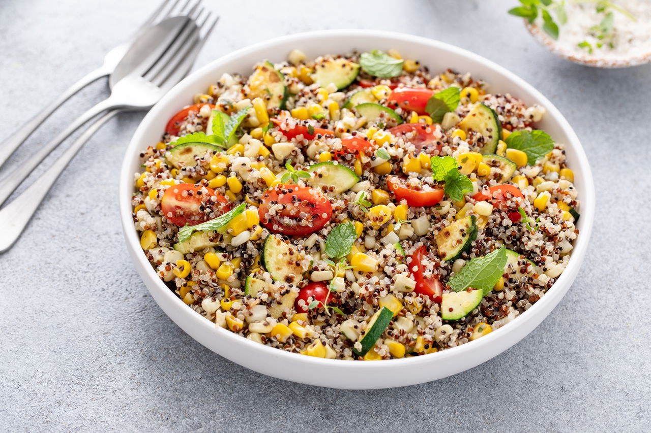 Kinoayı sebzelerle karıştırın. Zeytinyağı ve limonla tatlandırın. Bu tarif lif yönünden zengin olup uzun süre tok tutar.