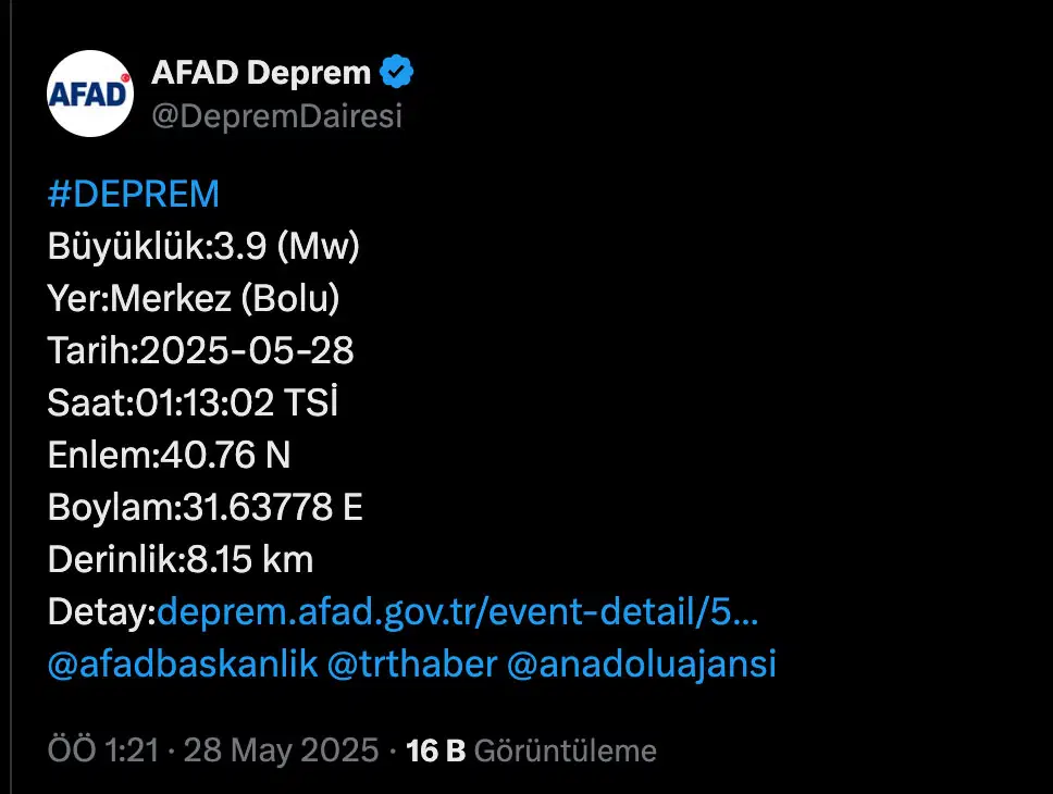 AFAD’ın verilerine göre; Bolu’nun Merkez ilçesinde saat 01.13’te yerin 8.15 kilometre altında 3.9 büyüklüğünde deprem meydana geldi.