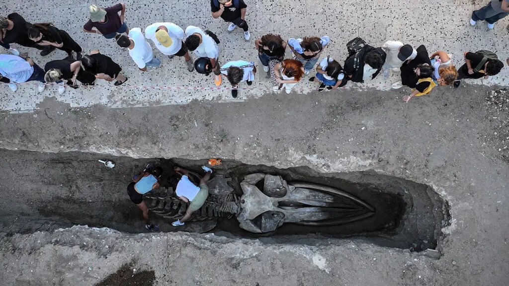 Mersin'de 2021'de sahile vurduktan sonra gömülen 14 metrelik Fin balinası iskeletinin bilimsel çalışmalarda kullanılmak üzere topraktan çıkarılma işlemi sürüyor.