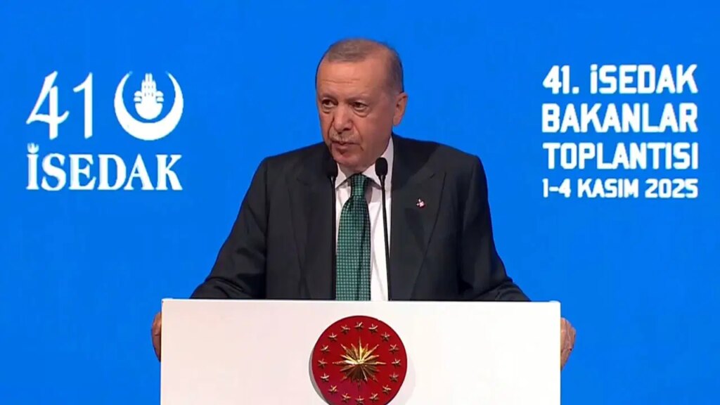 AKP'li Cumhurbaşkanı Recep Tayyip Erdoğan, İstanbul Kongre Merkezi'nde 41. İSEDAK Toplantısı Açılış Töreni'nde açıklamalarda bulundu. Erdoğan, "Gazze geçtiğimiz 2 yıl boyunca son asrın en barbar ve yabanî soykırımlarından birine sahne oldu. Filistinliler, İsrail’in katliamına uğradı. ABD Başkanı Trump’a da ateşkes görüşmelerindeki kararlılığından dolayı tekrar teşekkürlerimi iletiyorum" sözlerini kullandı.