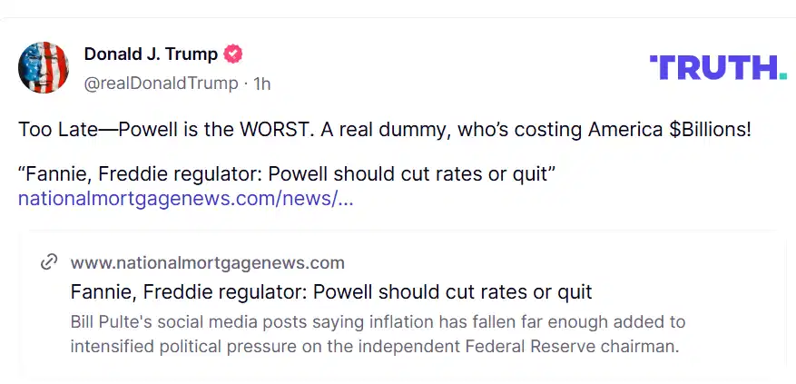 Trump, sosyal medya platformu Truth Social hesabından yaptığı bir paylaşımda Fed Başkanı Powell’ı hedef almıştı.