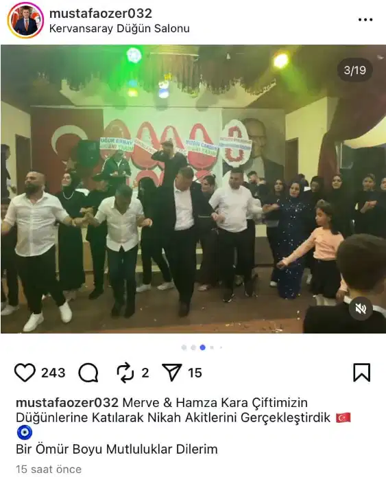 Özer kişisel sosyal medya hesabından paylaştığı Isparta’da katıldığı düğündeki halay görüntülerini “Merve & Hamza Kara Çiftimizin Düğünlerine Katılarak Nikah Akitlerini Gerçekleştirdik, Bir Ömür Boyu Mutluluklar Dilerim” notuyla yayınladı.