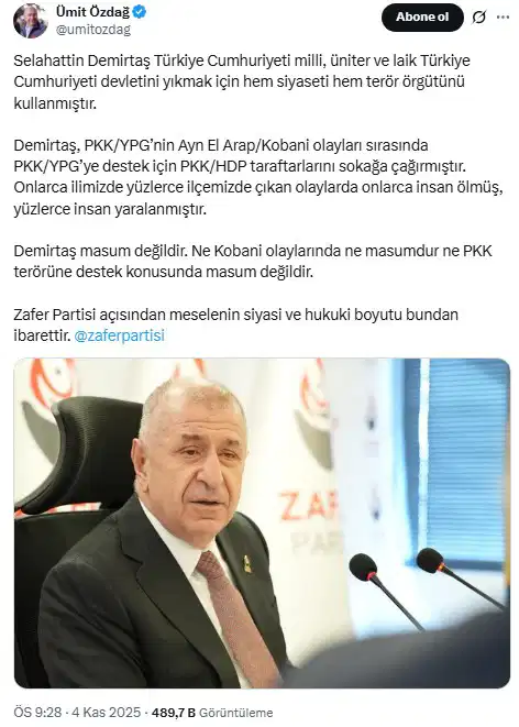 Sosyal medya hesabından konuya ilişkin paylaşımda bulunan Özdağ, Selahattin Demirtaş’ın masum olmadığını öne sürdü.