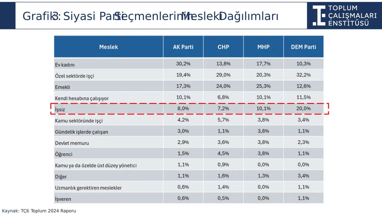 Toplum Çalışmaları Enstitüsü Data Tahlili ve Araştırma Yöneticisi Yağmur Uzunırmak’ın çalışmasına göre, DEM Parti seçmeni “işsizler” kümesinin yoğunluğu açısından diğer parti seçmenlerinden ayrışıyor.