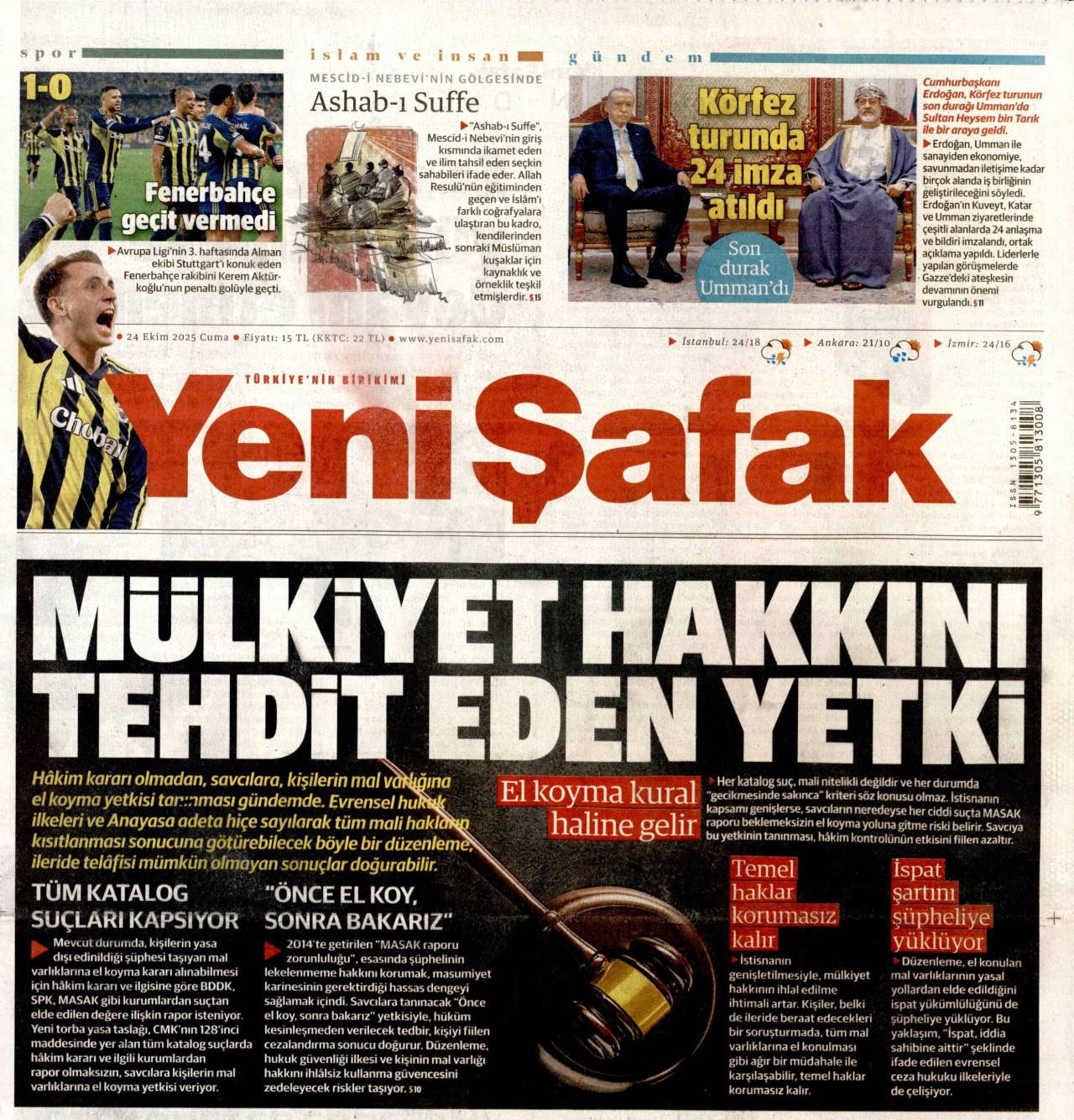 Yeni Şafak gazetesi, bugünkü (24 Ekim) manşetinde düzenleme için “Somut delillerle desteklenmeyen veya ilgili kurumlardan teyit alınmamış mal varlığı dondurma işlemlerine kapı açacak düzenleme, hukuk güvenliğiilkesi ve kişinin mal varlığı hakkını ihlalsiz kullanma güvencesini zedeleyecek riskler taşıyor” eleştirisinde bulundu.